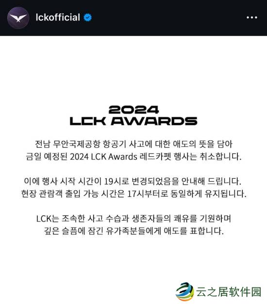 LCK官宣紧急发文,为了悼念今天出现的飞机失事事故,原定于今天举行的LCK Awards红毯活动取消。