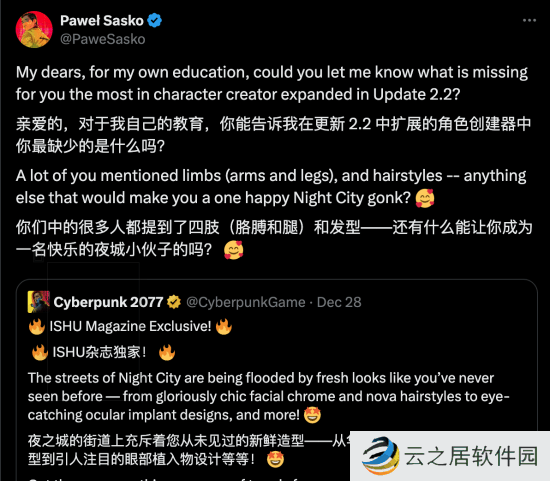 “亲爱的,能否告诉我你们觉得在2.2版本更新的角色编辑器中还缺少什么?许多人提到了四肢(手臂和腿)以及发型——还有什么能让你成为更快乐的夜之城居民吗?”