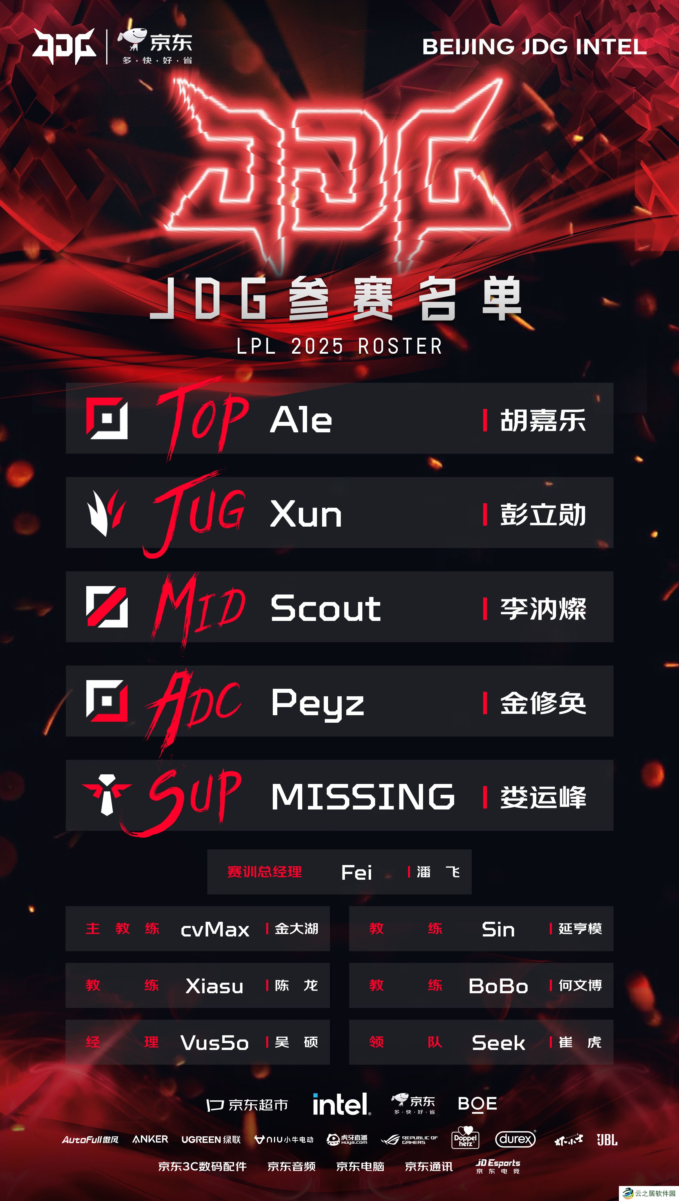 直播吧1月10日讯 LPL2025赛季第一赛段将打响,JDG官宣第一赛段首发阵容名单,上单Ale、打野Xun、中单Scout、下路Peyz、辅助Missing。