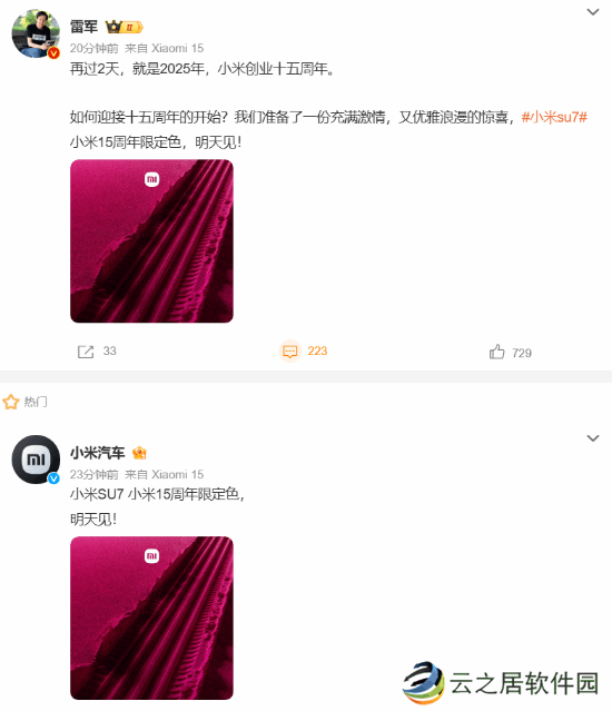 就在刚刚,小米汽车突然宣布,小米SU7小米15周年限定色将在明天正式揭晓。