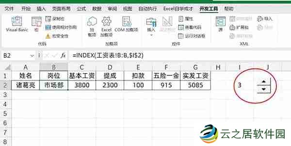 通过点击数值调节按钮,改变I2单元格的值,即可快速切换到不同员工的数据,并生成对应的工资条。