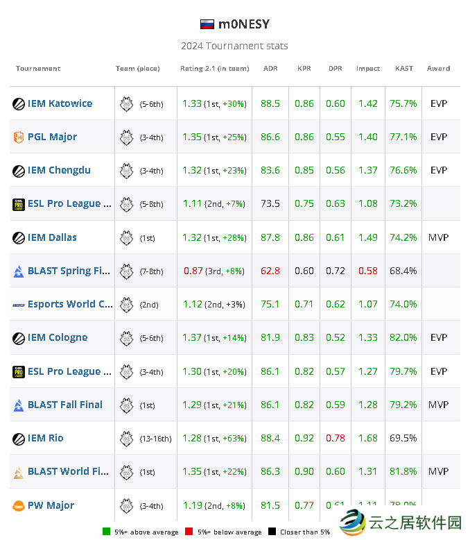 然而,这并不是m0NESY今年的最后一个奖项,他在BLAST秋季决赛中领衔G2夺冠。他在该赛事中的表现为1.29 rating,但真正令人印象深刻的是,他在该赛事中面对的都是2024年的顶尖队伍:FaZe、NAVI(两次)、Spirit和Vitality。他在小组赛中的1.29 rating在淘汰赛中被超越(1.30),而在总决赛中更是达到了1.35。