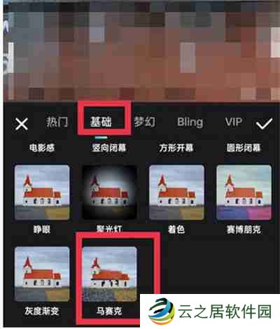 在特效页面找到“基础”选项卡,选择“马赛克”功能。 在视频画面上拖动鼠标,即可在选定区域添加马赛克。