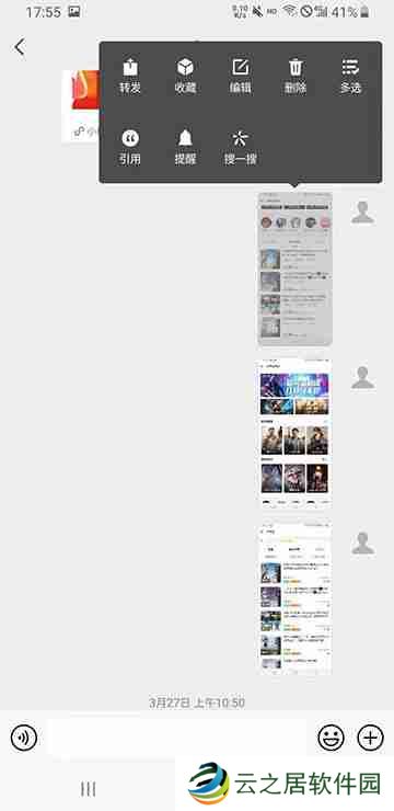 首先,找到需要转发的图片消息,然后长按约3秒钟,即可弹出菜单(此设计是为了避免误操作)。