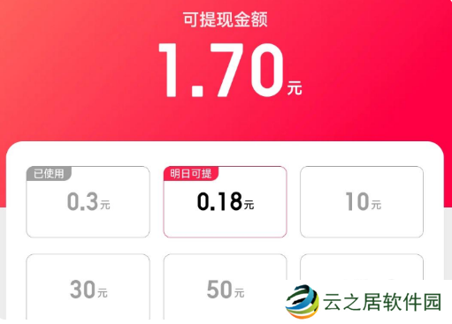 3、提现金额包括:0.3元、0.18元、10元、30元、50元、70元。