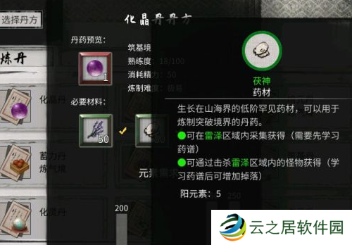 1、化晶丹:霓裳草×50、茯神×50、大蕨根茎×50。